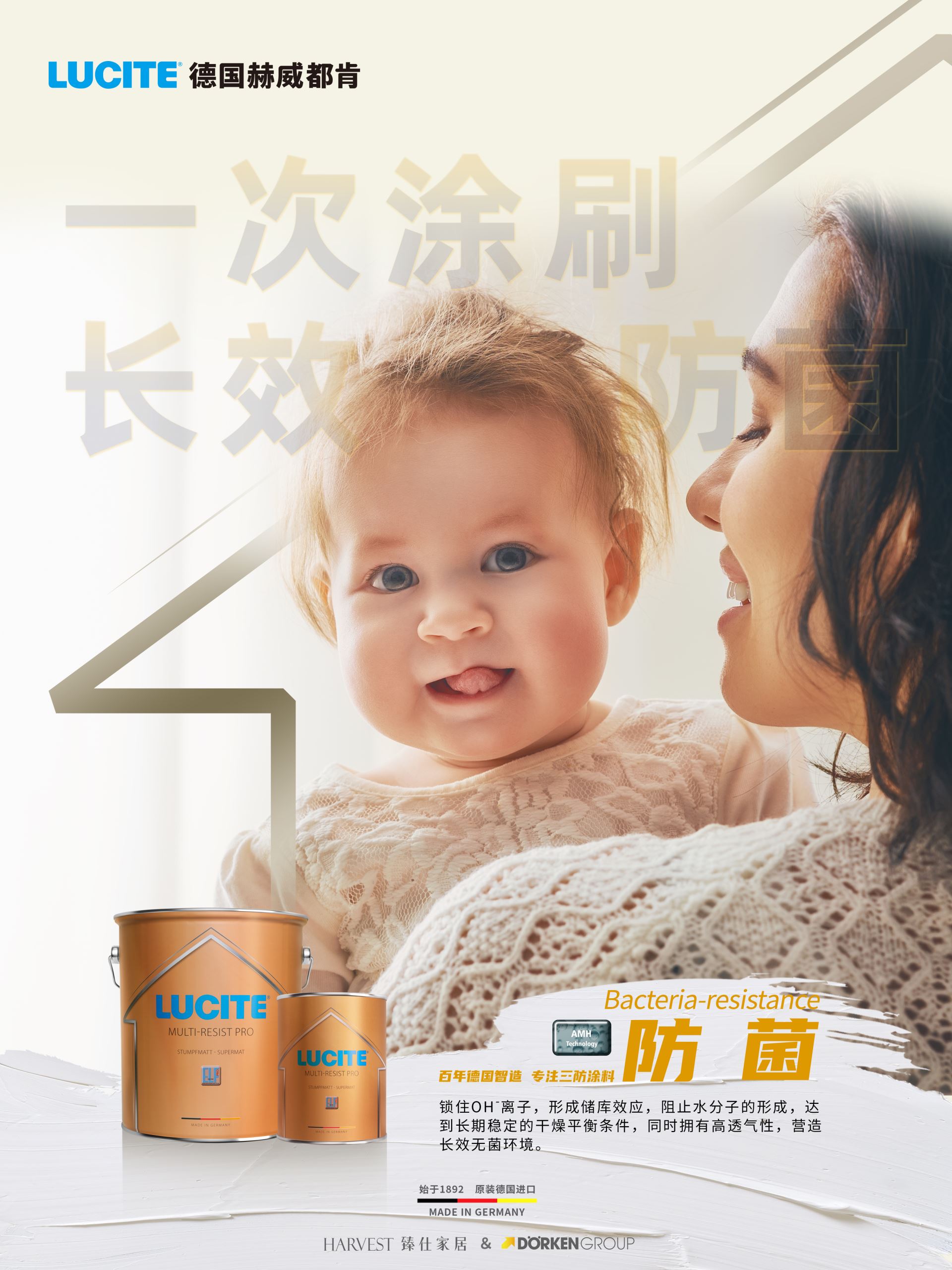 LUCITE德国赫威都肯以墙面涂料母婴防菌系列(Lucite® MultiResist PRO)对细菌、病毒和霉菌有抵抗力的功能令专家评委们耳目一新。同时也拥有着极高的环保性能,对健康无害的。由于母婴防菌系列的创新配方,新一代的墙面涂料没有滋生病菌的土壤。友好的与环境相融,令母婴系列适合于过敏症患者。LUCITE德国赫威都肯百年来一直致力于可持续的环保方案,以此来提高保护家居环境的健康。