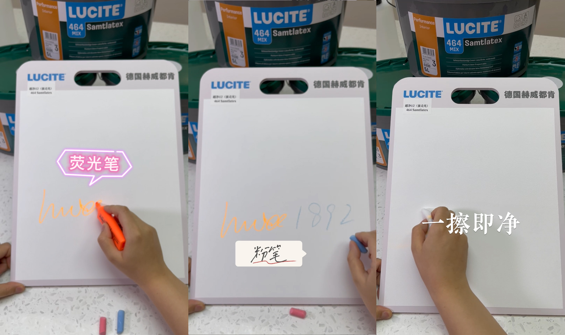我们特别测试了超净12的防污性能,下面的图片让您见证蛋壳光涂料的防污效果。在这个测试中,我们使用荧光笔和粉笔在蛋壳光涂料的样板上写字,然后用湿巾轻轻擦拭。只需轻轻一擦,污渍瞬间消失,样板恢复光洁无瑕。